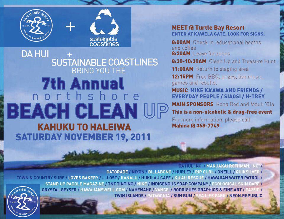 So this morning I ran to Turtle Bay resort from my house at Rocky’s, It’s my morning loop (5 miles each way). But today instead of just filling up my water bottle and looking buff at the pool, I went over to the “Da Hui’s 7th Annual Beach Clean Up” spent two hours helping our ocean by picking up trash. I got there a little late but I managed to fill two garbage bags between Turtle Bay and Kawela Bay. After the clean up they had a ‘Ono BBQ and concert. A lot of Aloha and great people.