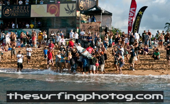 Went over to the Reef Pro today to watch the second day of competition. There were a few set rolling in but with only 20 minute heat times it was a battle of strategy. Most of the guys that won today got a solid wave off the buzzer followed it up with a small score and then played defense for the last 10 minutes. No shame in the game but it doesn’t lead to the best surfing for the spectators. John John was nailing airs and representing HI to the fullest.